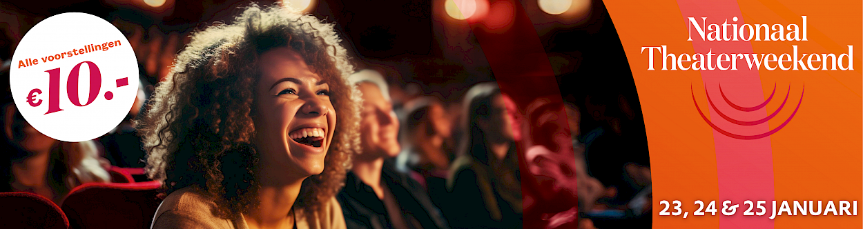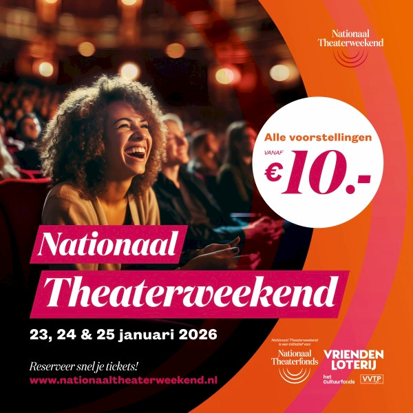 In het laatste weekend van januari vieren wij samen met de theaters door heel Nederland het Nationaal Theaterweekend, een bruisend weekend dat mensen samenbrengt en kennis laat maken met theater. Het hele weekend is het theater geopend voor iedereen. Behalve vier voorstellingen die je voor slechts tien euro kunt bezoeken, zijn er leuke activiteiten die toegankelijk zijn voor iedereen. Mis deze unieke belevenis niet!