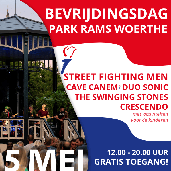 Op dinsdag 5 mei staat Park Rams Woerthe in Steenwijk volledig in het teken van vrijheid, ontmoeting en muziek. Van 12.00 tot 20.00 uur ben je van harte welkom rondom de sfeervolle muziekkoepel voor een feestelijke middag en avond vol liveoptredens. De toegang is gratis.