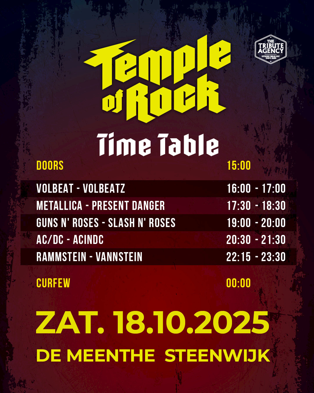 Met ACinDC, finalist The Tribute: Battle of the Bands za 18 okt | 16:00 uur evenement, Muziek | Evenementenhal € 30,00Dit unieke en internationale tributefestival komt op zaterdag 18 oktober 2025 weer naar De Meenthe in Steenwijk, met de vetste en strakste alternatieve en hardrock tributes uit de hele wereld.